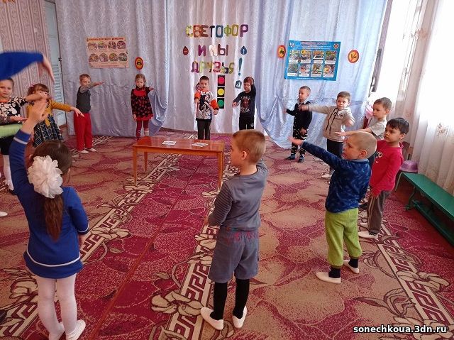 В гости к ребятам пришёл Светофор, который рассказал об истории возникновения светофора, его видах. Светофор пригласил ребят в путешествие, в котором нужно будет показать знания и умения. В путешествие отправились дети старшей группы с воспитателем Абдулаевой М.Г. Дети объединились в 2 команды «Водители» и «Пешеходы», отгадывали загадки, решали логические ситуации, играли в игры «Светофор», «Водитель – пассажир», «Это можно, это нет», «Ядро Барона Мюнхаузена», участвовали в эстафете «Кто быстрее доедет на машине».